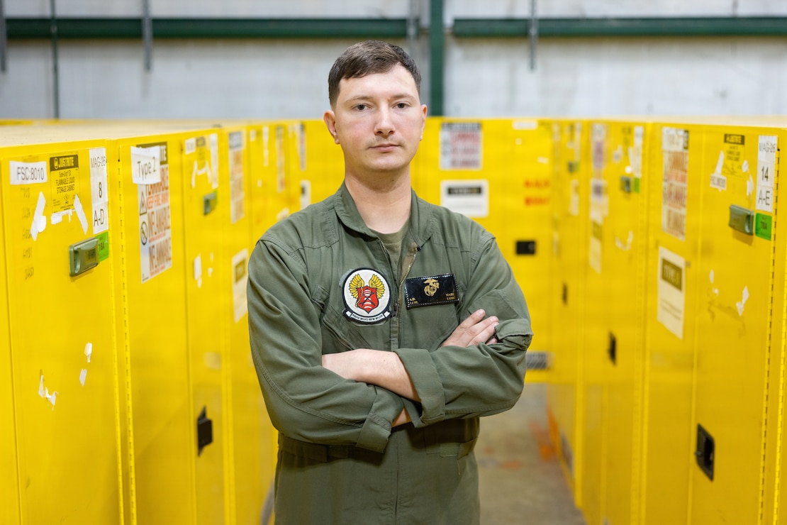 U.S. Marine Corps Lance Cpl. Asher Mabe, an airframes mechanic with Marine Heavy Helicopter Squadron