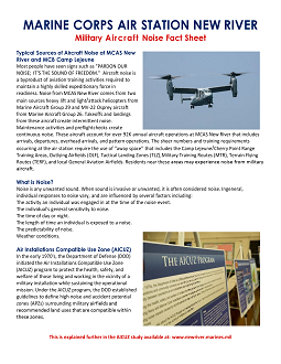 Marine Corps Air Station New River and the 2nd Marine Aircraft Wing appreciate the enormous sacrifices made by our neighbors as we train for the defense of our country. Among those sacrifices is the occasional disruption of daily life by the sometimes-intrusive noise caused by training on station and throughout our local community.