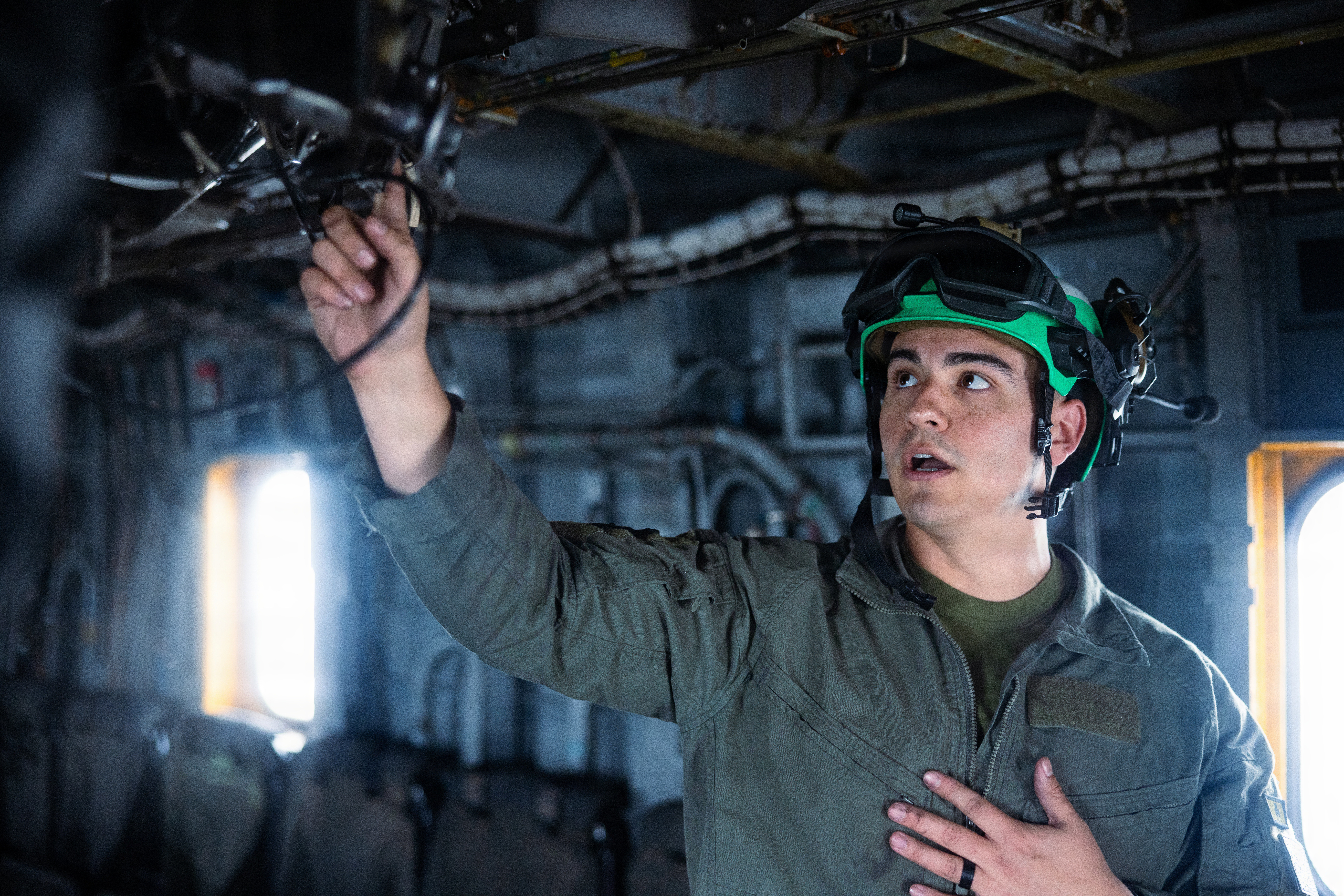 JACKSONVILLE, NORTH CAROLINA, UNITED STATES - U.S. Marine Corps Sgt. Jake Herny, flight equipment mechanic, Marine Heavy Helicopter Squadron (HMH) 464, Marine Aircraft Group 29, 2nd Marine Aircraft Wing, gives an instructional brief inside a CH53E Super Stallion helicopter on Marine Corps Air Station New River, in Jacksonville, North Carolina, Oct. 28, 2025. HMH-464’s mission is to provide assault support transport of heavy equipment, troops and supplies in all weather conditions during expeditionary, joint or combined operations. (U.S. Marine Corps photo by Cpl. Loriann Dauscher)